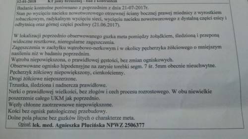 witajcie Dziewczyny, dawno nie zaglądalam, bo niestety wrocilam po dluzszym urlopie d pracy i prawie z niej nie wychodze. Mama kontynuje Avastin, marker spadl z 20 do 17stu. Karoboplatyne i taksol skonczyla na 7 wlewach we wrześniu, teraz juz sam avastin co 3 tygodnie. Przeszla dwie operacje. Zrobili kolejne tk i prosze powiedzcie mi co o tym myslicie. Będę wdzieczna. Teraz mam mniejsy kontakt z lekarzami, bo Mama juz sama dziala.